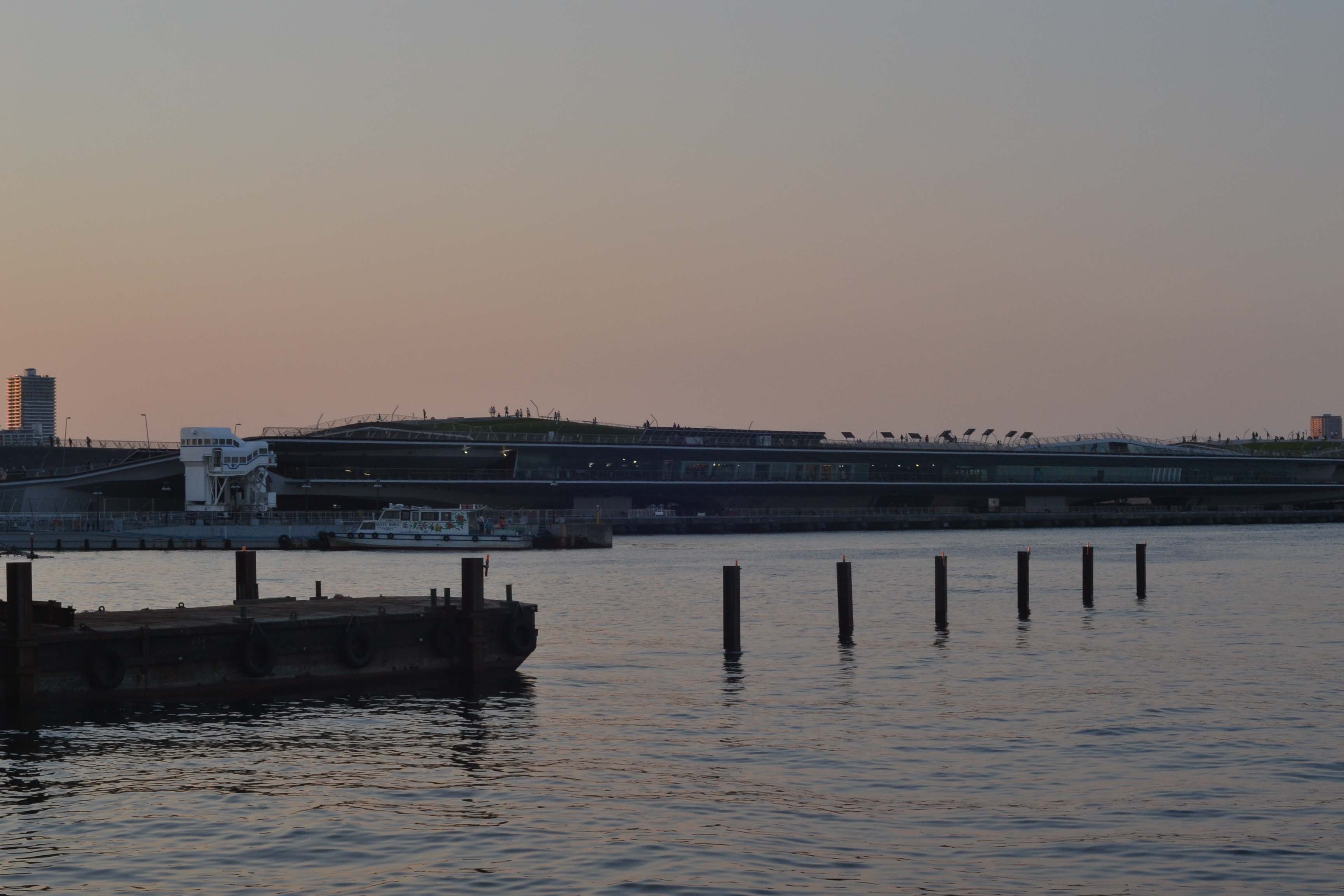 日が暮れ始めてくらいですが、屋上が芝生になっている桟橋です。